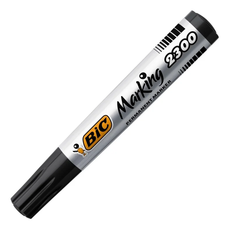 Le marqueur permanent BIC Marking 2300 ECOlutions peut écrire jusqu'à 1 km sans se dessécher même s'il est laissé à découvert pendant 1 mois. il est parfait pour écrire sur les surfaces comme le carton, le plastique, le métal, les CD,.. Sa pointe biseautée très résistante permet de faire varier l'épaisseur du trait entre 3,7 et 5,5 mm. couleur noir