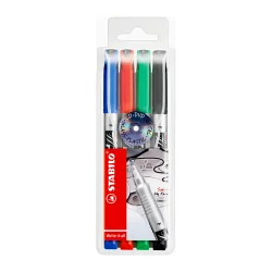 Le marqueur permanent STABILO Write-4-all Fine (F) est disponible en paquet de 4 avec les couleurs bleu, noir, vert et rouge, offrant une largeur de trait de 0,7 mm. Il est testé pour écrire sur plus de 1 000 surfaces, dont le verre, le plastique, les photos, la céramique, les films et le métal.