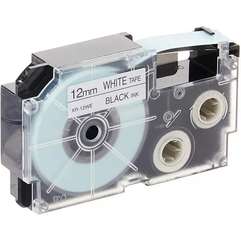 Cassette à Ruban adhésif Casio XR-12WE1 noir sur blanc, 12 mm x 8 m, auto-adhésif et résistant. Idéal pour des étiquettes claires et durables. Compatible avec plusieurs étiqueteuses Casio (KL-60, KL-120, KL-130, KL-820, KL-7400, KL-G2, KL-HD1).