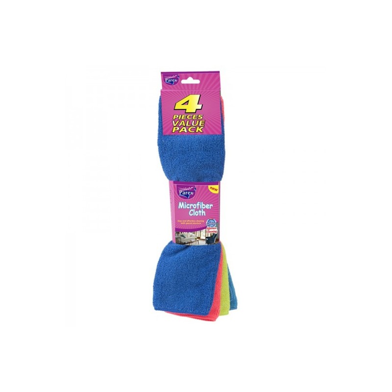 Ensemble de 4 chiffons de nettoyage Parex, en microfibres de 38 x 28 cm, conçus avec une technologie avancée pour une absorption d'eau optimale. Ils assurent un nettoyage sans laisser de traces ni de taches, grâce à leur résistance et leur technologie.