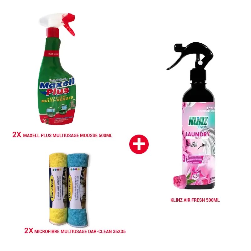 Pack multi-usage comprenant 2 mousses nettoyantes MultiUsage 500 ml, 2 microfibres Dar-Clean 35x35 cm assorties, et 1 spray désodorisant AIR FRESH 500 ml KLINZ. Idéal pour un nettoyage efficace et une fraîcheur durable.
