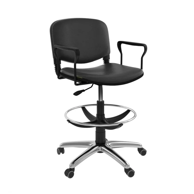 Assise et dossier rembourrés en mousse souple. Le revêtement en simili cuir. Accoudoirs fixe en métal recouvert de polypropylène couleur noir. Mécanisme tournant, réglable en hauteur avec contact permanent du dossier. Structure étoilé à 05 branches fixe en avec repose pieds métallique en époxy noir.