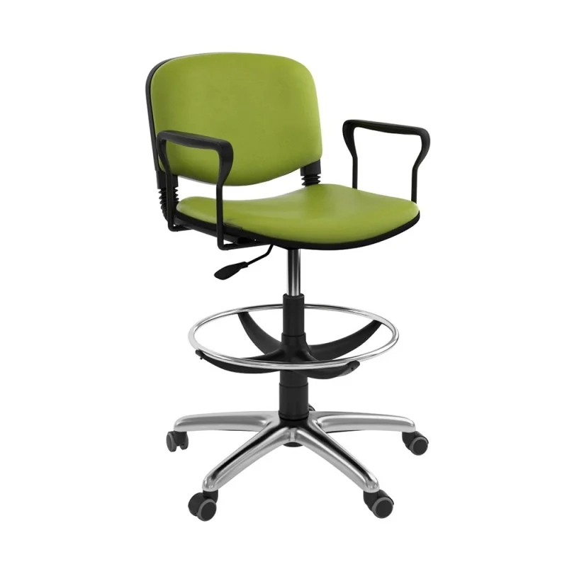 Assise et dossier rembourrés en mousse souple. Le revêtement en simili cuir. Accoudoirs fixe en métal recouvert de polypropylène couleur noir. Mécanisme tournant, réglable en hauteur avec contact permanent du dossier. Structure étoilé à 05 branches fixe en avec repose pieds métallique en époxy noir.