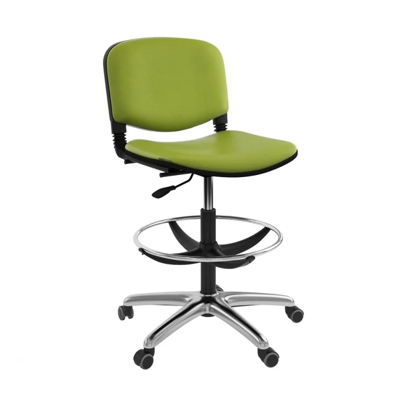 Assise et dossier rembourrés en mousse souple. Le revêtement en simili cuir. Mécanisme tournant, réglable en hauteur avec contact permanent du dossier. Structure étoilé à 05 branches en couleur chromé avec 05 roulettes tournantes roulantes à double galets même matière.