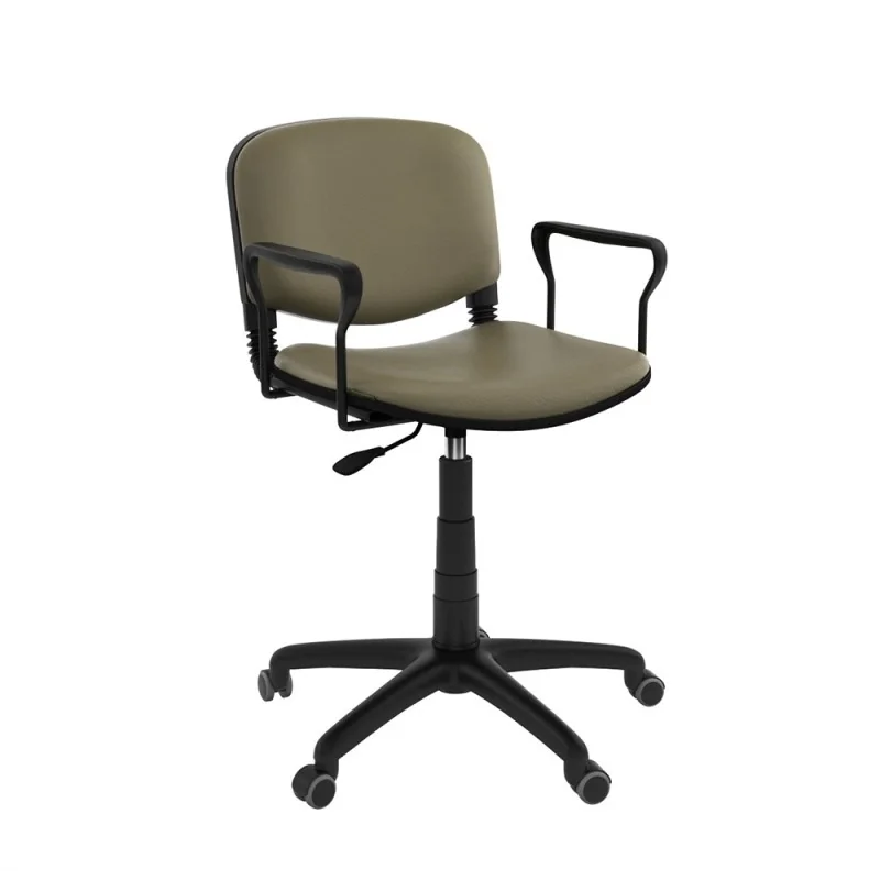 Assise et dossier rembourrés en mousse souple. Le revêtement en simili cuir. Accoudoirs fixe en métal recouvert de polypropylène couleur noir. Mécanisme tournant, réglable en hauteur avec contact permanent du dossier. Structure étoilé à 05 branches en couleur noir avec 05 roulettes tournantes roulantes à double galets même matière.