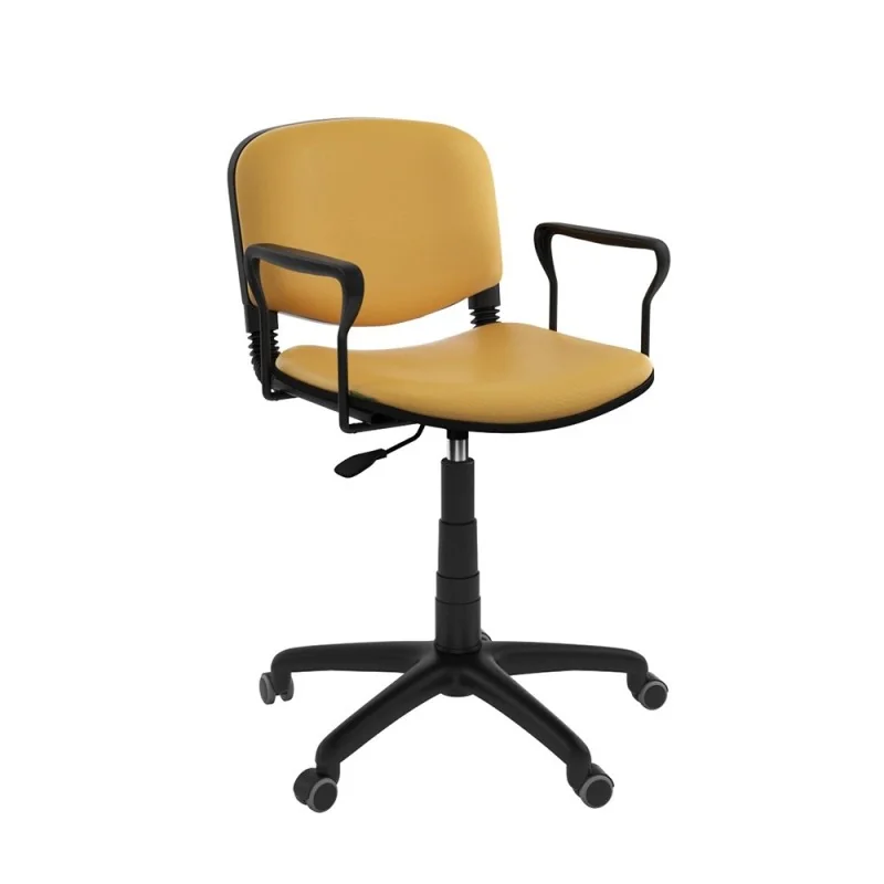 Assise et dossier rembourrés en mousse souple. Le revêtement en simili cuir. Accoudoirs fixe en métal recouvert de polypropylène couleur noir. Mécanisme tournant, réglable en hauteur avec contact permanent du dossier. Structure étoilé à 05 branches en couleur noir avec 05 roulettes tournantes roulantes à double galets même matière.