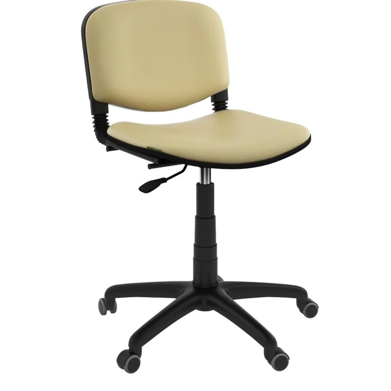Assise et dossier rembourrés en mousse souple. Le revêtement en simili cuir. Mécanisme tournant, réglable en hauteur avec contact permanent du dossier. Structure étoilé à 05 branches en couleur noir avec 05 roulettes tournantes roulantes à double galets même matière.