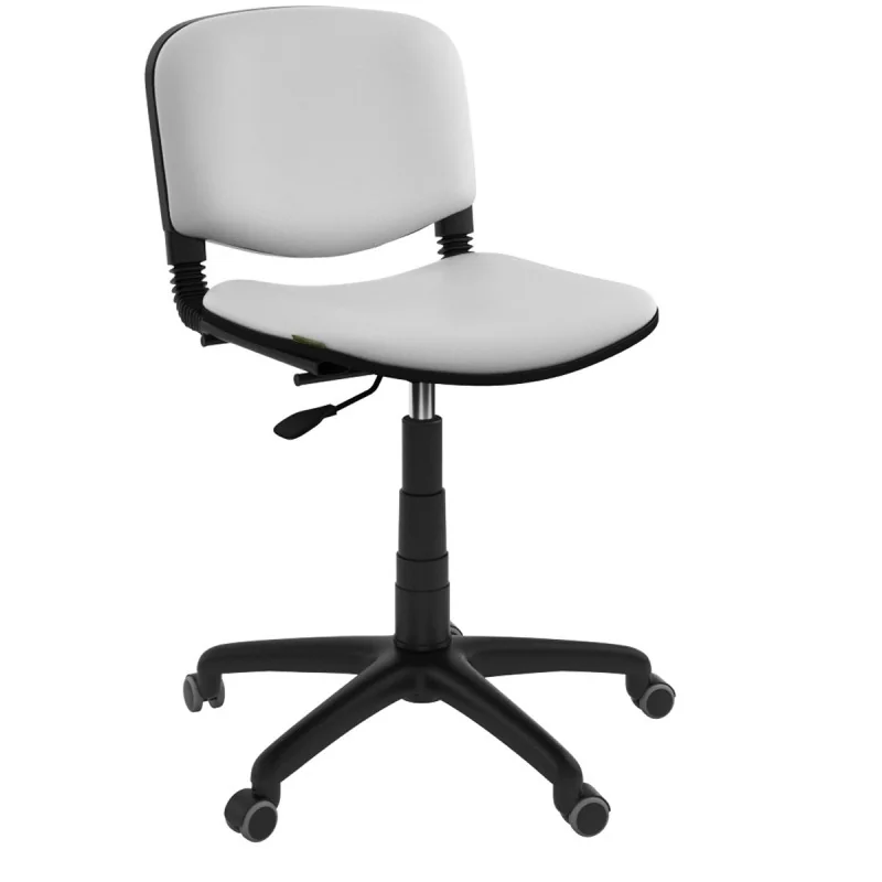 Assise et dossier rembourrés en mousse souple. Le revêtement en simili cuir. Mécanisme tournant, réglable en hauteur avec contact permanent du dossier. Structure étoilé à 05 branches en couleur noir avec 05 roulettes tournantes roulantes à double galets même matière.