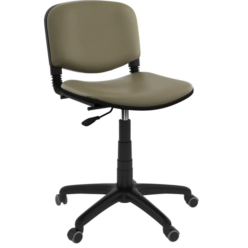 Assise et dossier rembourrés en mousse souple. Le revêtement en simili cuir. Mécanisme tournant, réglable en hauteur avec contact permanent du dossier. Structure étoilé à 05 branches en couleur noir avec 05 roulettes tournantes roulantes à double galets même matière.