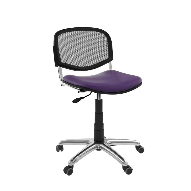 Assise rembourré en mousse souple revêtu en simili cuir, dossier en tissu mesh. Structure étoilé à 5 branches en métal chromé avec 05 roulettes tournantes roulantes à double galets.