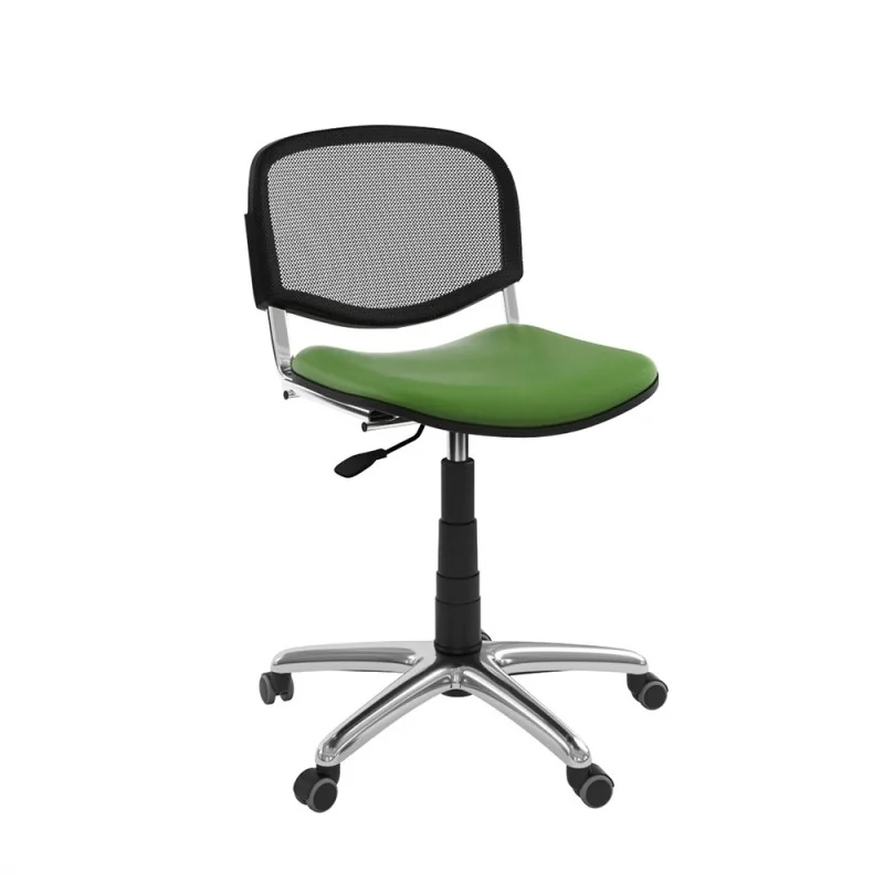 Assise rembourré en mousse souple revêtu en simili cuir, dossier en tissu mesh. Structure étoilé à 5 branches en métal chromé avec 05 roulettes tournantes roulantes à double galets.
