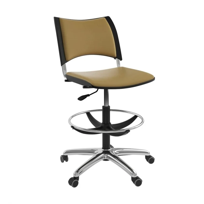 Assise et dossier rembourrés en mousse souple. Revêtement en simili cuir. Mécanisme tournant, réglable en hauteur avec contact permanent du dossier. Structure étoilé à 05 branches fixe en avec repose pieds couleur chromé.