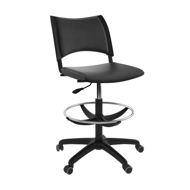 Assise et dossier rembourrés en mousse souple. Revêtement en simili cuir. Mécanisme tournant, réglable en hauteur avec contact permanent du dossier. Structure étoilé à 05 branches fixe en avec repose pieds métallique en époxy noir.
