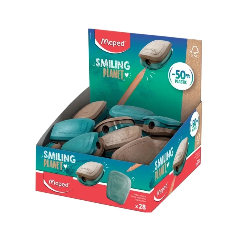 Taille-crayons Maped Pulse Smiling Planet, ergonomique et compact, possède une réserve facile à ouvrir et fermer, et est fabriqué à 50 % avec des fibres de bois provenant de forêts gérées durablement.