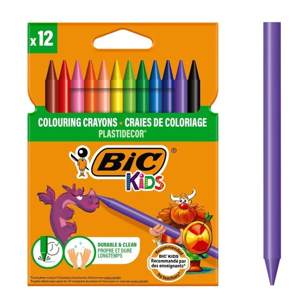 Pochette de 12 Crayons de Cire Plastidecor de Bic Kids. Conçus pour les petites mains, ces crayons offrent des couleurs vives et une application douce. Ils sont parfaits pour stimuler la créativité des enfants tout en garantissant une utilisation sans danger.