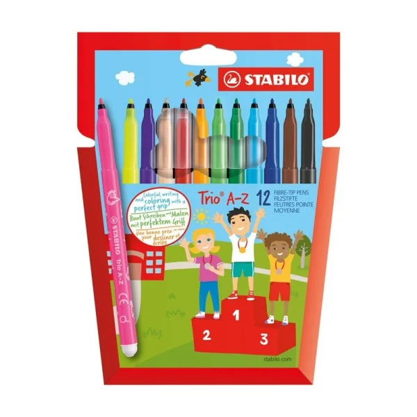 Pochettes de 12 feutres STABILO Trio A-Z incluent 12 couleurs, dont 2 fluo. Leur corps imprimé présente divers motifs et lettres de l'alphabet. Dotés d'une zone de préhension triangulaire et d'une pointe moyenne bloquée, ils sont parfaits pour tracer lettres et chiffres ou colorier de grandes surfaces. L'encre est lavable et le capuchon est ventilé.