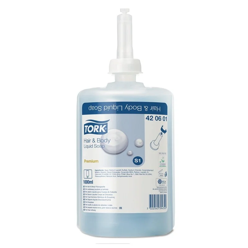 Le savon liquide corps et cheveux Tork offre aux hôtels, écoles et centres sportifs la commodité d'un gel douche et d'un shampooing dans un produit tout-en-un.