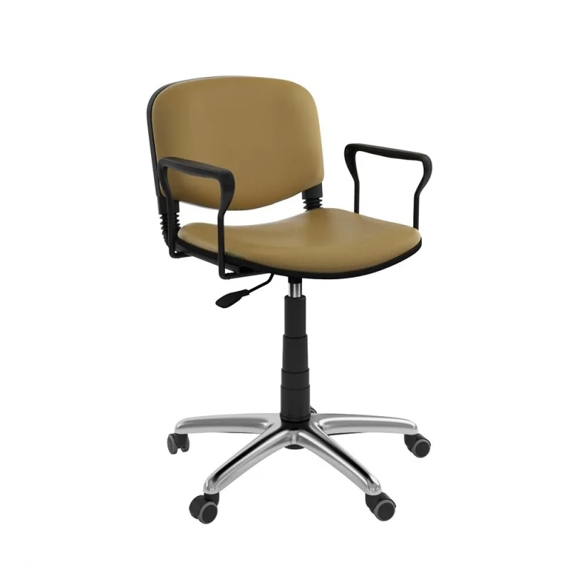Assise et dossier rembourrés en mousse souple. Le revêtement en simili cuir. Accoudoirs fixe en métal recouvert de polypropylène couleur noir. Mécanisme tournant, réglable en hauteur avec contact permanent du dossier. Structure étoilé à 05 branches en couleur chromé avec 05 roulettes tournantes roulantes à double galets même matière.