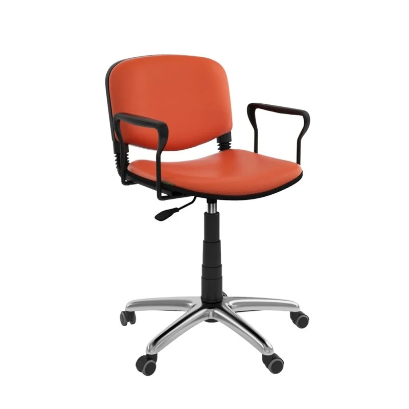 Assise et dossier rembourrés en mousse souple. Le revêtement en simili cuir. Accoudoirs fixe en métal recouvert de polypropylène couleur noir. Mécanisme tournant, réglable en hauteur avec contact permanent du dossier. Structure étoilé à 05 branches en couleur chromé avec 05 roulettes tournantes roulantes à double galets même matière.