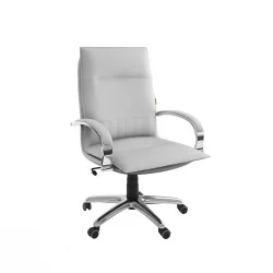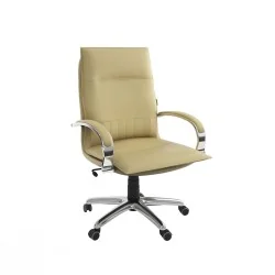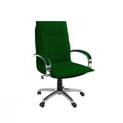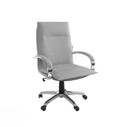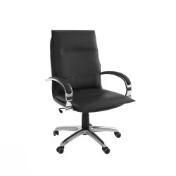 Assise et dossier rembourrés en mousse souple avec couche de dacron. Revêtement en simili cuir. Accoudoirs fixe en métal chromé avec une partie rembourré, tapissé. Mécanisme tournant, roulant, réglable en hauteur et en inclinaison. Structure étoilée à 05 branches en métal chromé avec 05 roulettes tournantes roulantes à double galets.