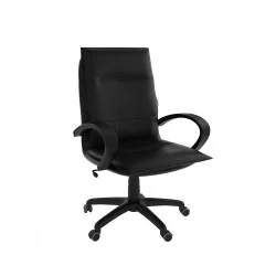 Assise et dossier rembourrés en mousse souple avec couche de dacron. Revêtement en simili cuir. Accoudoirs fixe en Polypropylène couleur noir. Mécanisme tournant, roulant, réglable en hauteur et en inclinaison. Structure étoilée à 05 branches en Polypropylène couleur noir avec 05 roulettes tournantes roulantes à double galets même matière.