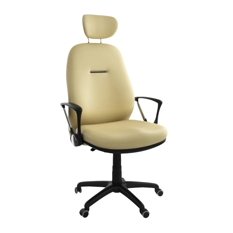 Assise et dossier en mousse injectée. Revêtement en simili cuir. Repose tête en mousse injectée revêtu en simili cuir. Accoudoirs en acier chromé et Polypropylène noir. Mécanisme Basculant, tournant, roulant, réglable en hauteur et en inclinaison. Structure étoilée à 05 branches en Polypropylène couleur noir avec 05 roulettes tournantes roulantes à double galets.