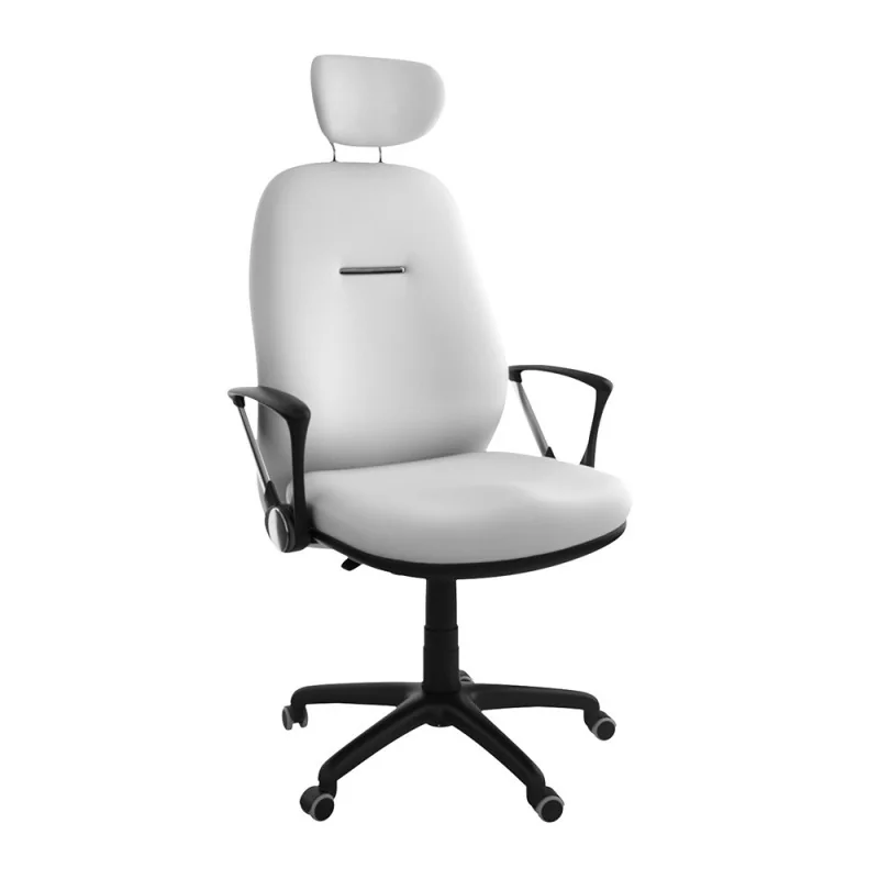 Assise et dossier en mousse injectée. Revêtement en simili cuir. Repose tête en mousse injectée revêtu en simili cuir. Accoudoirs en acier chromé et Polypropylène noir. Mécanisme Basculant, tournant, roulant, réglable en hauteur et en inclinaison. Structure étoilée à 05 branches en Polypropylène couleur noir avec 05 roulettes tournantes roulantes à double galets.