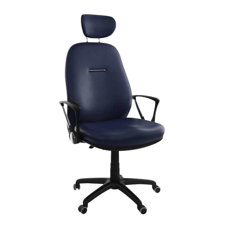 Assise et dossier en mousse injectée. Revêtement en simili cuir. Repose tête en mousse injectée revêtu en simili cuir. Accoudoirs en acier chromé et Polypropylène noir. Mécanisme Basculant, tournant, roulant, réglable en hauteur et en inclinaison. Structure étoilée à 05 branches en Polypropylène couleur noir avec 05 roulettes tournantes roulantes à double galets.