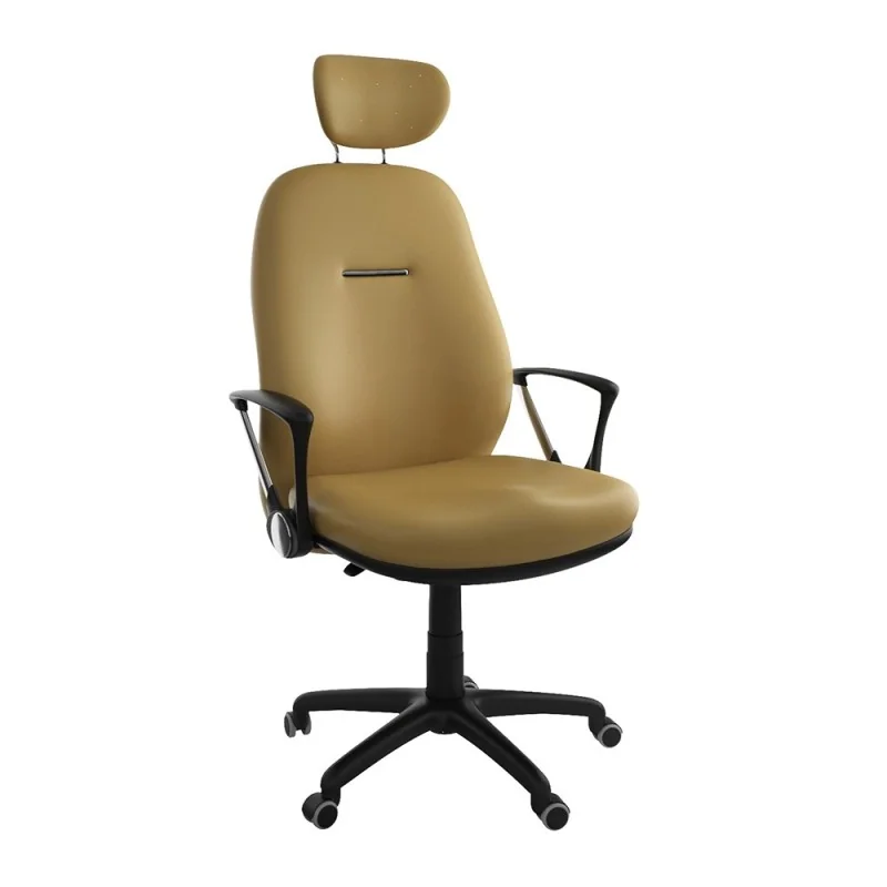 Assise et dossier en mousse injectée. Revêtement en simili cuir. Repose tête en mousse injectée revêtu en simili cuir. Accoudoirs en acier chromé et Polypropylène noir. Mécanisme Basculant, tournant, roulant, réglable en hauteur et en inclinaison. Structure étoilée à 05 branches en Polypropylène couleur noir avec 05 roulettes tournantes roulantes à double galets.