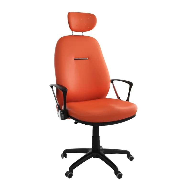 Assise et dossier en mousse injectée. Revêtement en simili cuir. Repose tête en mousse injectée revêtu en simili cuir. Accoudoirs en acier chromé et Polypropylène noir. Mécanisme Basculant, tournant, roulant, réglable en hauteur et en inclinaison. Structure étoilée à 05 branches en Polypropylène couleur noir avec 05 roulettes tournantes roulantes à double galets.