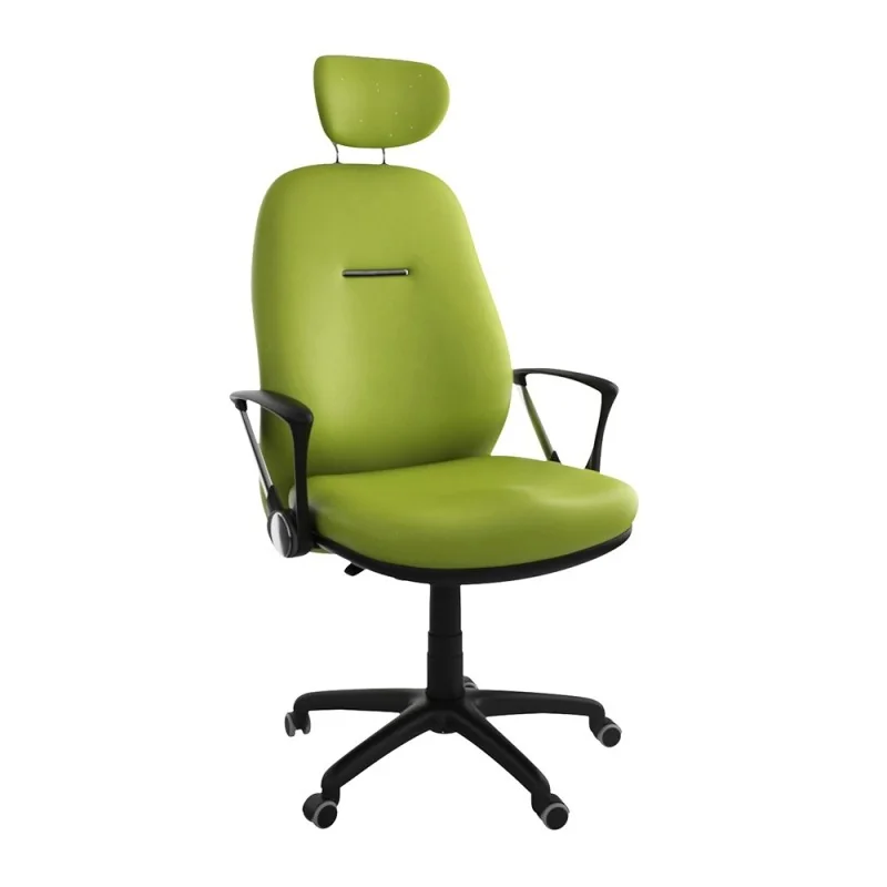 Assise et dossier en mousse injectée. Revêtement en simili cuir. Repose tête en mousse injectée revêtu en simili cuir. Accoudoirs en acier chromé et Polypropylène noir. Mécanisme Basculant, tournant, roulant, réglable en hauteur et en inclinaison. Structure étoilée à 05 branches en Polypropylène couleur noir avec 05 roulettes tournantes roulantes à double galets.