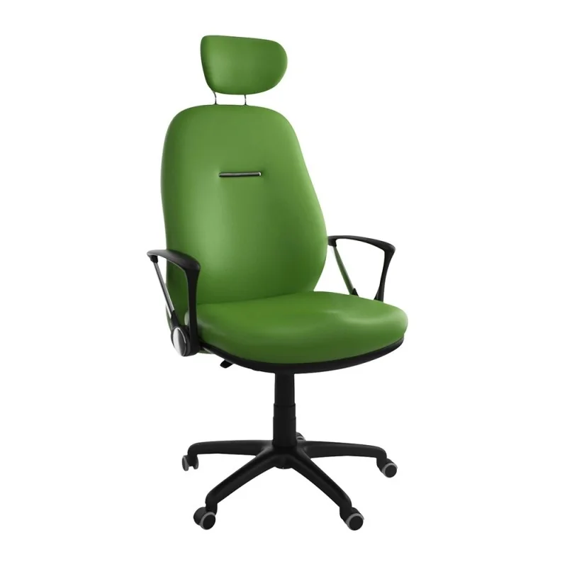 Assise et dossier en mousse injectée. Revêtement en simili cuir. Repose tête en mousse injectée revêtu en simili cuir. Accoudoirs en acier chromé et Polypropylène noir. Mécanisme Basculant, tournant, roulant, réglable en hauteur et en inclinaison. Structure étoilée à 05 branches en Polypropylène couleur noir avec 05 roulettes tournantes roulantes à double galets.