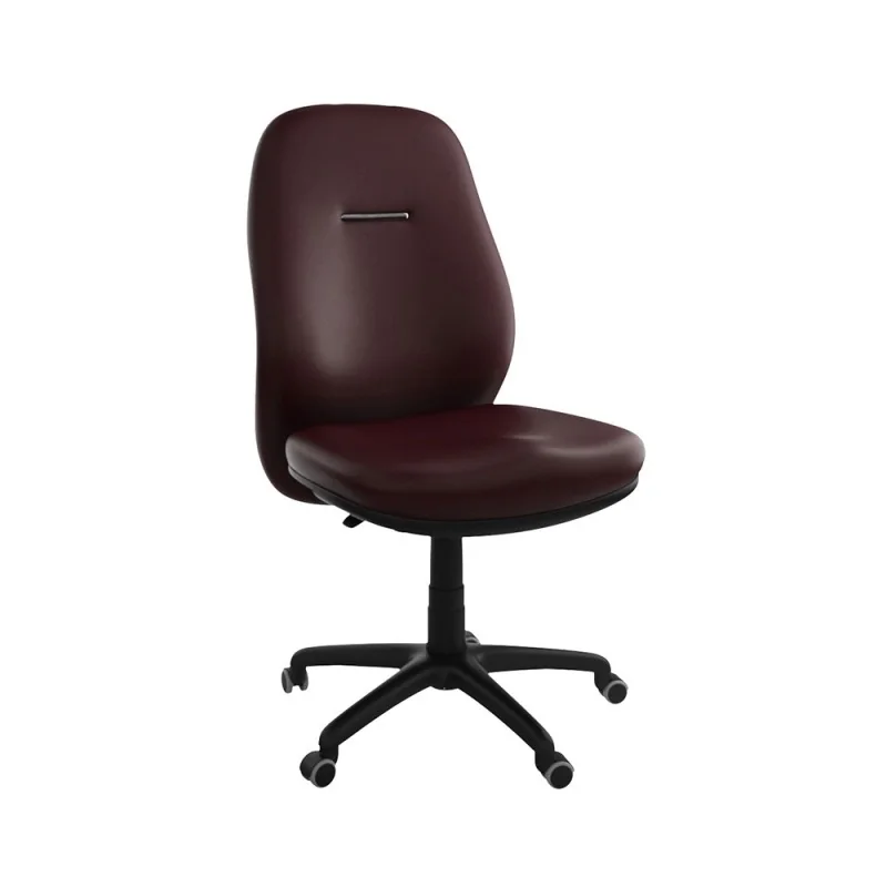 Assise et dossier en mousse injectée. Revêtement en simili cuir. Mécanisme Basculant, tournant, roulant, réglable en hauteur et en inclinaison. Structure étoilée à 05 branches en Polypropylène couleur noir avec 05 roulettes tournantes roulantes à double galets.
