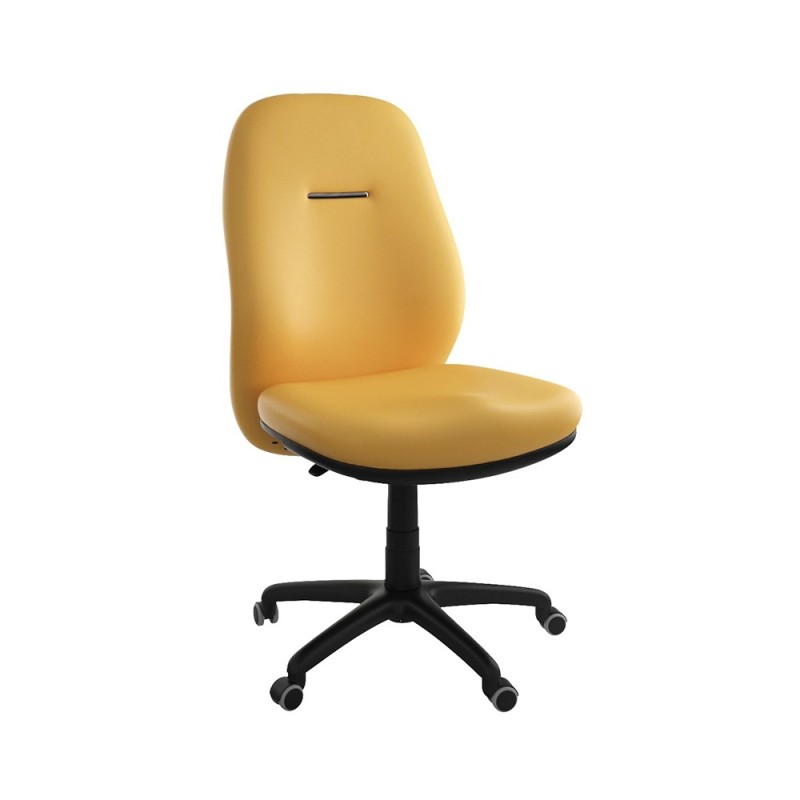 Assise et dossier en mousse injectée. Revêtement en simili cuir. Mécanisme Basculant, tournant, roulant, réglable en hauteur et en inclinaison. Structure étoilée à 05 branches en Polypropylène couleur noir avec 05 roulettes tournantes roulantes à double galets.