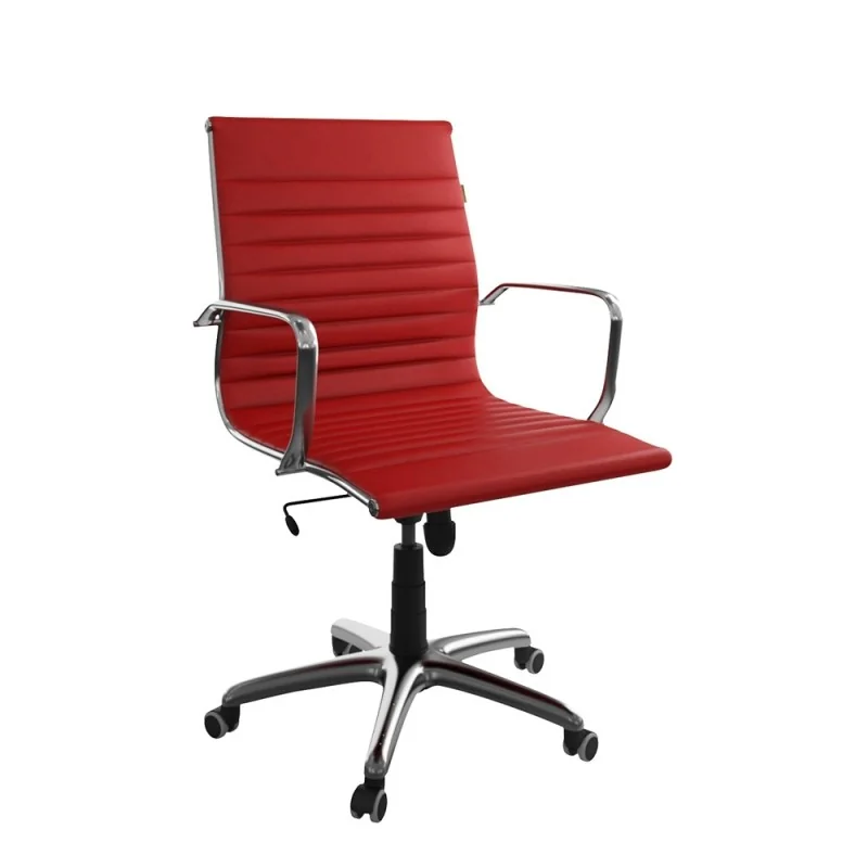 Assise et dossier rembourrés en mousse souple avec couche de dacron. Revêtement en simili cuir. Accoudoirs fixe en métal chromé. Mécanisme tournant, roulant, réglable en hauteur et en inclinaison. Structure étoilée à 05 branches en métal chromé avec 05 roulettes tournantes roulantes à double galets