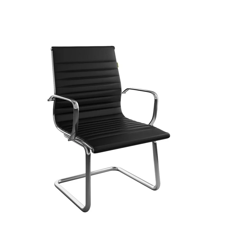 Assise et dossier rembourrés en mousse souple avec couche de dacron. Revêtement en simili cuir. Accoudoirs fixe en métal chromé. Mécanisme tournant, roulant, réglable en hauteur et en inclinaison. Structure en métal chromé (luge ) avec patins danti-dérapage.