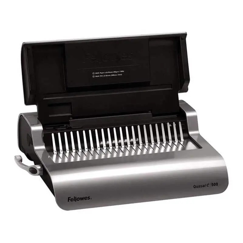 Le Fellowes Quasar-E 500 est un perforelieur électrique idéal pour un usage bureautique intensif. Il permet de perforer jusqu’à 25 feuilles par simple pression d’un bouton et de relier jusqu’à 500 feuilles avec des anneaux plastiques de 50 mm. Pratique et précis, il dispose d’une butée de taquage réglable, d’un bac de rangement pour anneaux, d’un sélecteur de diamètre, ainsi que d’un tiroir à confettis à ouverture automatique. Il est livré avec un kit de consommables pour relier jusqu’à 10 documents dès la première utilisation.