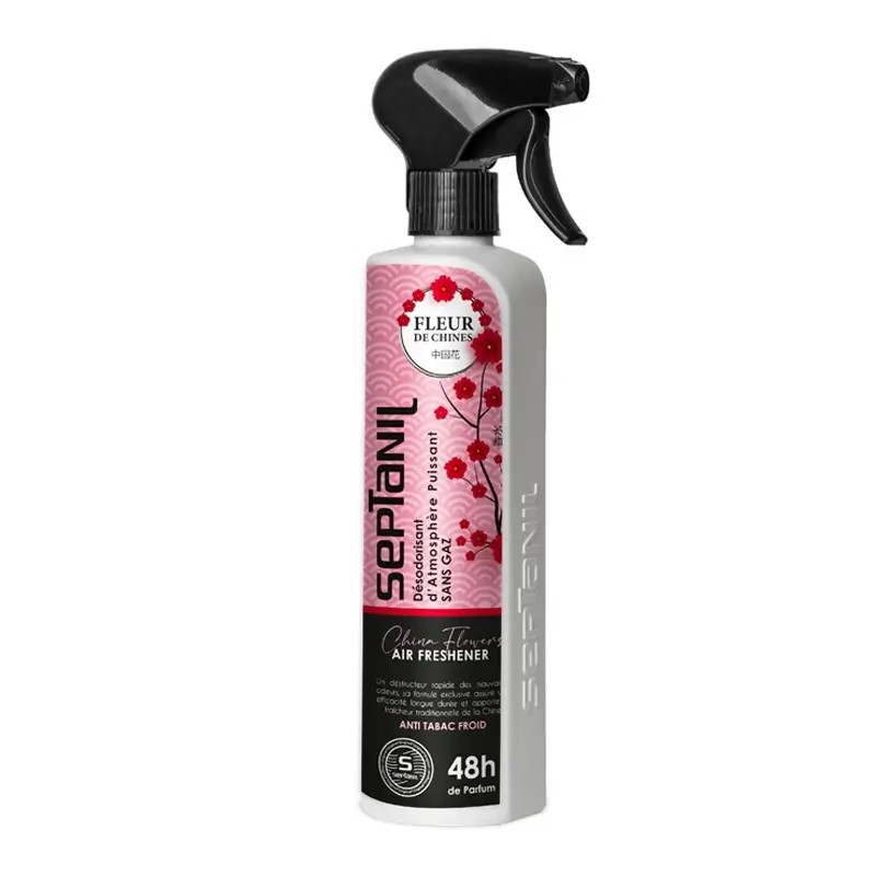 Cette désodorisant désinfectant est particulièrement recommandé pour l’assainissement de l’air et des surfaces dans les vêtements, voitures, cabinets médicaux, maternités, crèches, écoles, bureaux, restaurants, salles de sport. Parfum fleur de chine , il absorbe et neutralise les mauvaises odeurs et apporte la fraicheur traditionnelle de la chine . cette parfun peut rester 48 h espace fermé, 3 jours sur les vêtements, 5 jours dans la voiture. Composition Ethanol 95°, eau distillé, 5-chloro-2-(2.4 dichlorophenoxy) phenol, dissodium EDTA, fragrance. contenance 500 ml