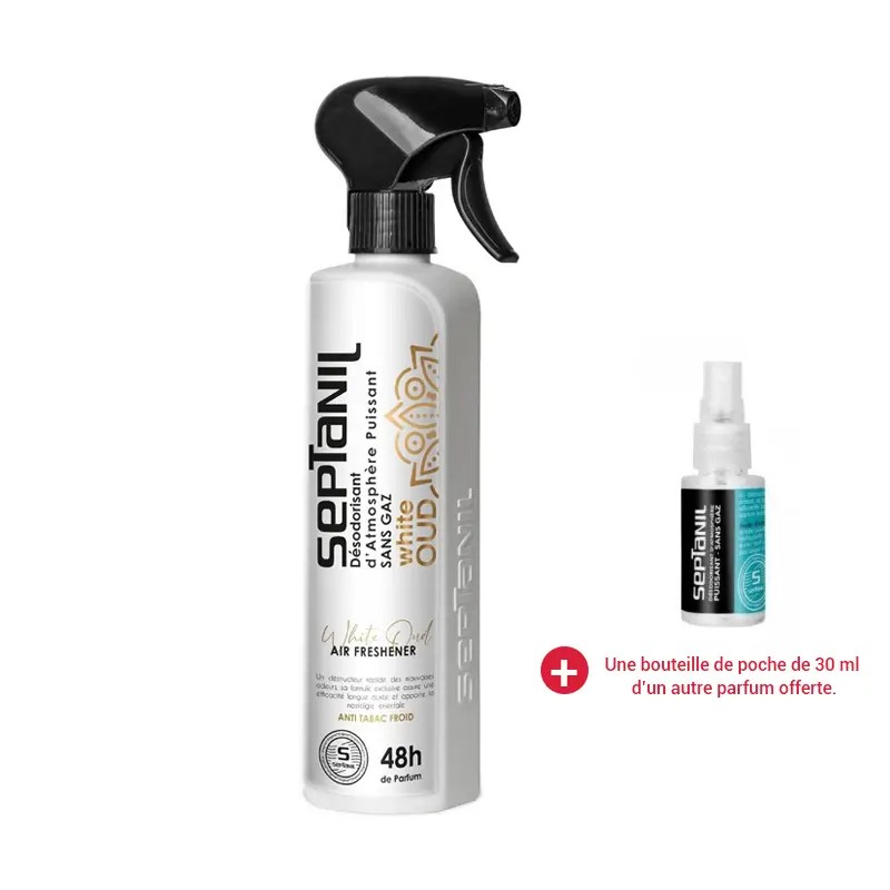 SEPTANIL Oud White 500 ml : désodorisant puissant sans gaz qui élimine immédiatement les mauvaises odeurs (anti-tabac froid) et laisse un parfum élégant et durable. Idéal pour voitures, bureaux, sanitaires et espaces peu aérés.
