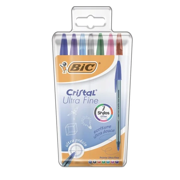lot de 7 stylos Cristal Ultra Fine, avec une pointe fine de 0,7 mm, offre une encre de qualité pour une écriture précise sur tous types de papier. Les barils teintés permettent de voir le niveau d'encre, et les stylos sont disponibles en bleu, bleu clair, noir, rose, rouge, vert clair et violet.