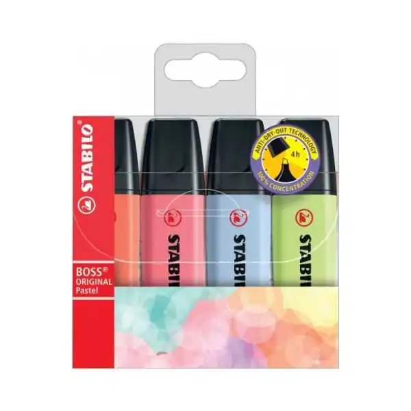 Le surligneur écologique STABILO GREEN BOSS Pastel en pack de 4 avec les couleurs pastel touche de turquoise, touche de menthe, blush rose et brume lilas .La durabilité rencontre la tendance : surligneur composé à 83 % de plastique recyclé ,4 heures de protection contre le dessèchement sans capuchon