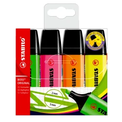 La pochette de 4 surligneurs STABILO BOSS ORIGINAL offre une solution pratique avec son encre multicolore et son point biseauté pour un usage sur papier. Disponible en vert, rose, orange et jaune, offrant ainsi durabilité et praticité.
