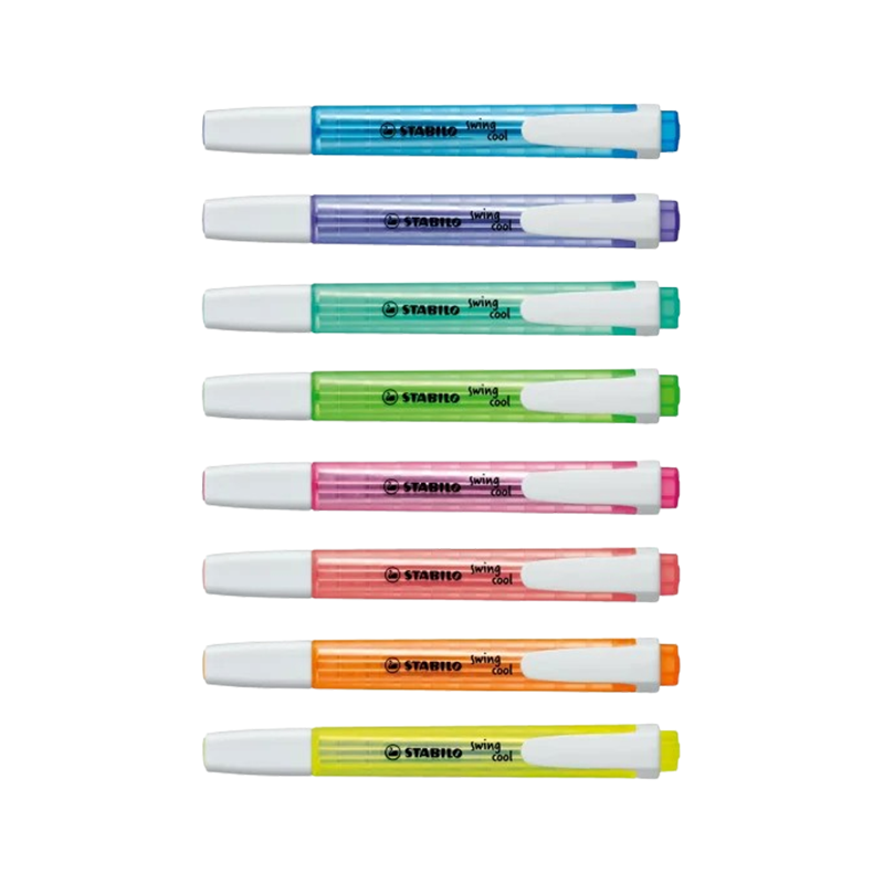 STABILO swing cool disponible en jaune, bleu, turquoise, orange, lavande ,rouge , vert et rose. Son design est doté d'une surface antidérapante transparente pour une prise en main confortable. Grâce à la technologie STABILO Anti-Dry-Out, il offre jusqu'à quatre heures de protection contre le dessèchement.