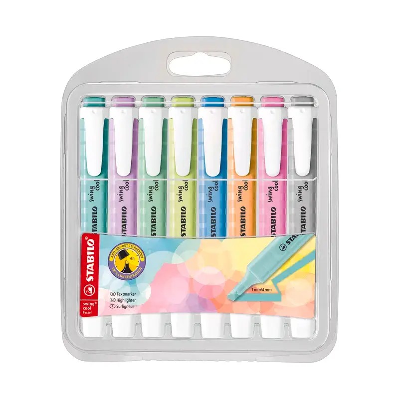 Pochette de 8 surligneurs STABILO Swing Cool Pastel réunit des couleurs pastel douces et tendances dans un format fin et nomade. Chaque surligneur possède une pointe biseautée 1–4 mm, une technologie anti-dessèchement permettant de rester ouvert 4 heures, ainsi qu’un clip pratique.