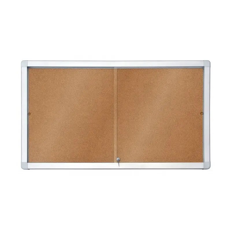 Vitrine d'affichage murale avec fond en liège, cadre en aluminium et porte coulissante en verre sécurisée par serrure. Elle est fournie avec un kit de montage, dispose d’un support en acier zingué et mesure 94 x 68 cm, avec une profondeur intérieure de 24 mm.