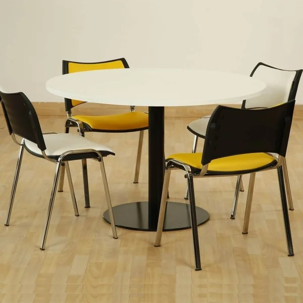 a table de réunion Ovni ronde est élégante et pratique, Plateau rond diamètre 100 en panneau en stratifié .Piétement métallique central peinture époxy.